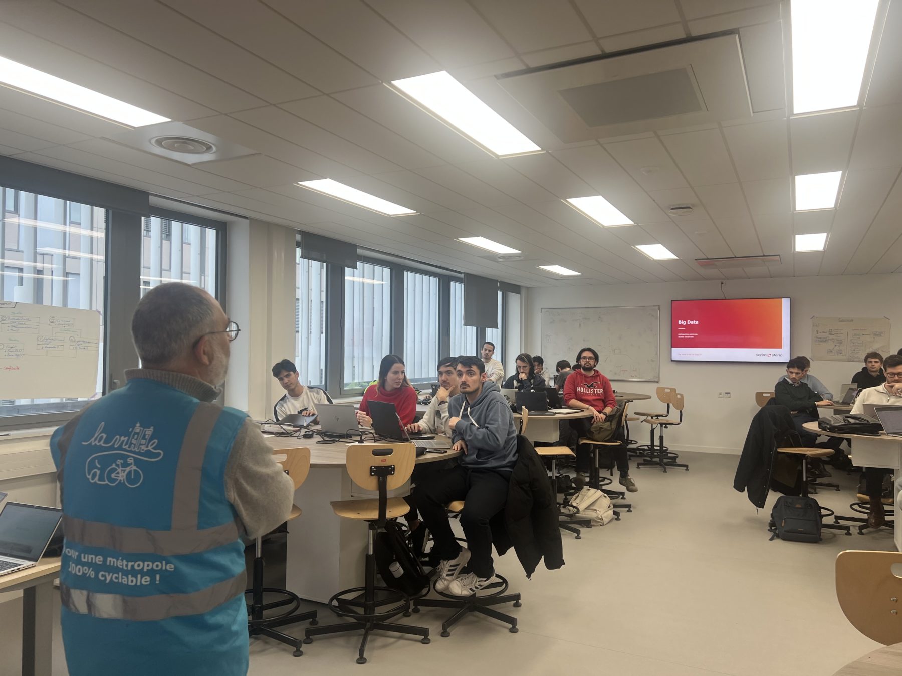 Dans le cadre du datathon organisé par CPE pour clôturer le cours « Big data », les étudiantes et étudiants de cette promotion 2025 ont planché sur ces questions ! Accompagnés par leurs professeurs et des bénévoles de la Ville à Vélo, ils ont travaillé pendant une après-midi et une journée à concevoir des solutions originales pour l’association, sur la base de divers jeux de données.